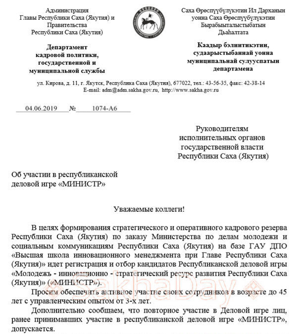 В начале июня в республиканские госучреждения было направлено письмо с настоятельной просьбой «обеспечить активное участие своих сотрудников в республиканской деловой игре «Министр», передает Sakhaday.