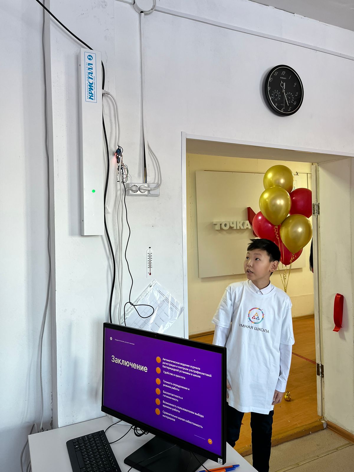 Своими успехами с нами поделился и ученик 5 класса Ян Заровняев, который смастерил рециркуляторы для очистки воздуха в здании, которые включаются автоматически и на протяжении 30 минут три раза в день очищают воздух: «Располагается рециркулятор на базе, работает на релейном модуле, выдает электроэнергию и обратно забирает. На нем же установлены часы, которые показывают реальное время и по времени в 9, 11 и 13 часов рециркулятор включается и работает».