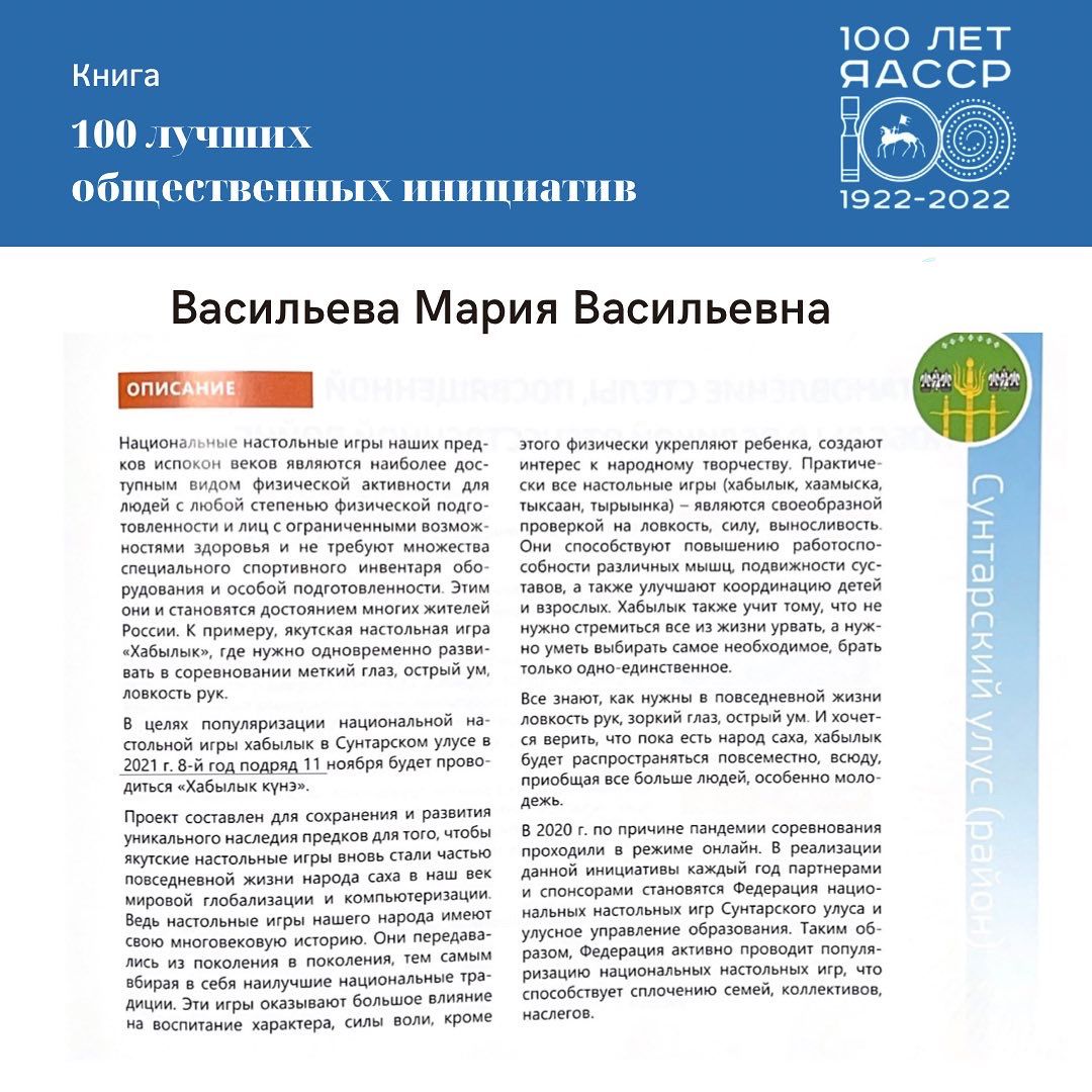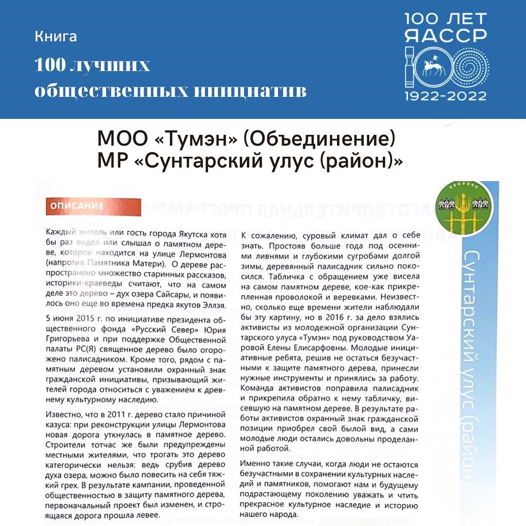Общественные инициативы Сунтарского улуса вошли в Книгу почета «100 лучших общественных инициатив к 100 - летию Якутской АСССР