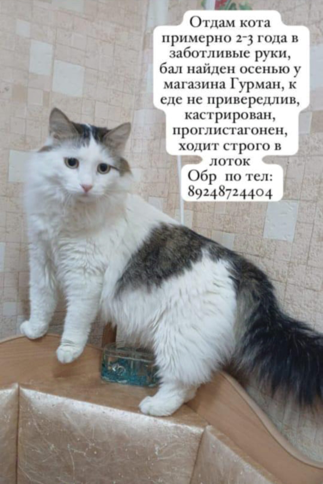 Приучен к лотку, кастрирован. Характер спокойный, ласковый, идет на руки. С собой отдадут корм, миски, лоток. Подробнее узнавать по ссылке.
