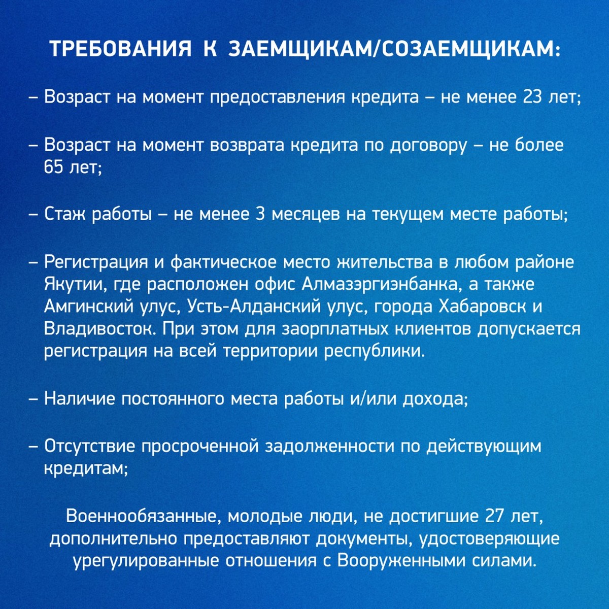 Более подробно ознакомиться с условиями кредитного продукта можно в офисах Алмазэргиэнбанка.