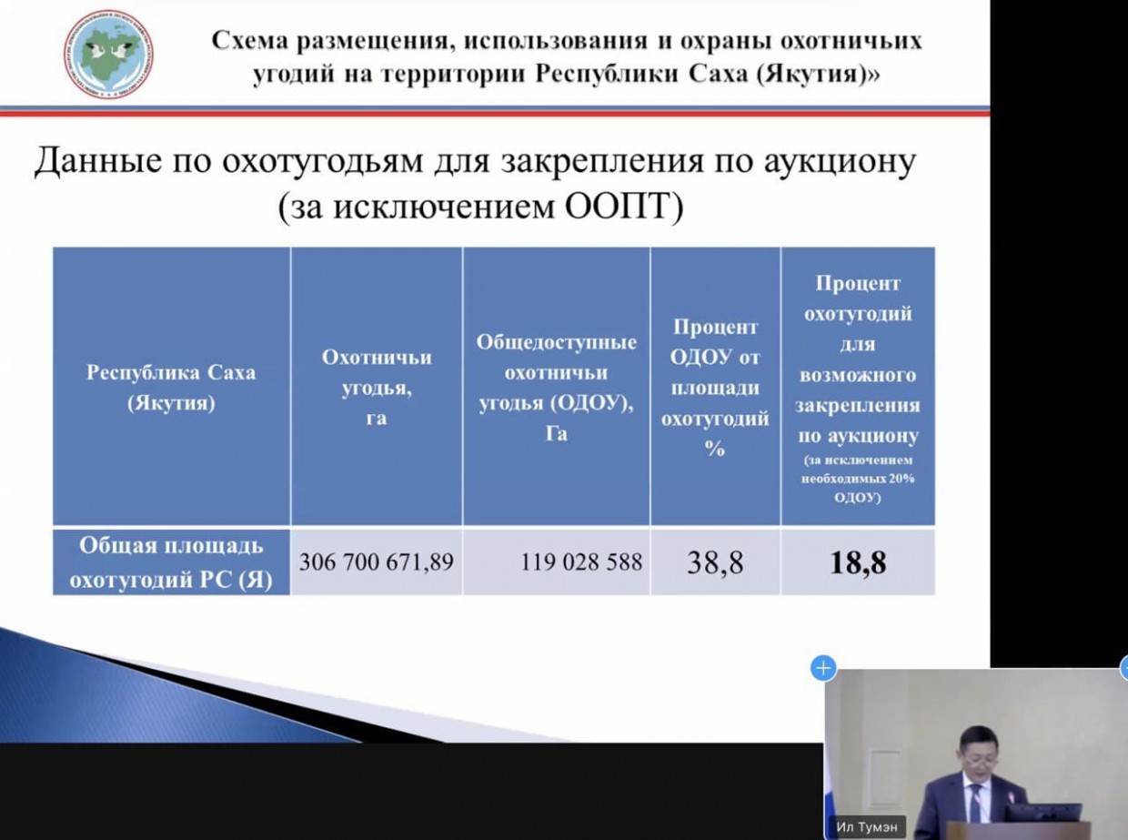 «Сейчас речь не идет об аукционах. Наоборот, речь идет о сохранении территорий общедоступных охотничьих угодий, учитывая предложения охотобществ из улусов. Сейчас мы не обсуждаем законопроект. Его мы рассмотрим отдельно».