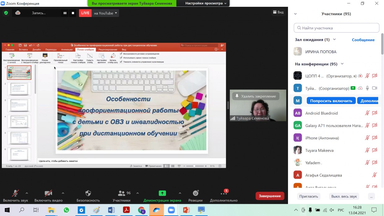 Благодаря выступлению Туйаары Семеновой, педагога-психолога института новых технологий РС(Я), были освещены особенности профориентационной работы с детьми с ОВЗ и инвалидностью при дистанционном обучении.