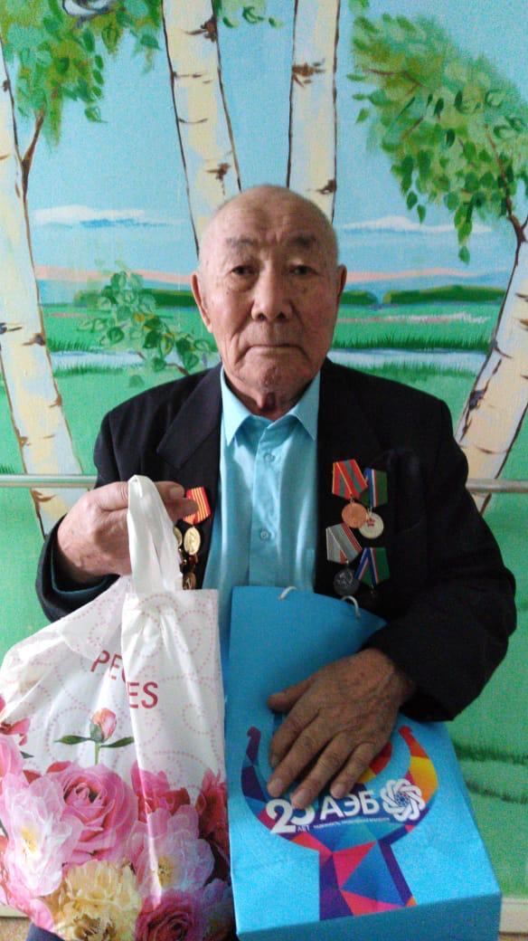 В селе Майя ветерану войны Василию Прокопьеву с теплыми пожеланиями вручили праздничный подарок - жилет из верблюжьей шерсти и букет цветов.