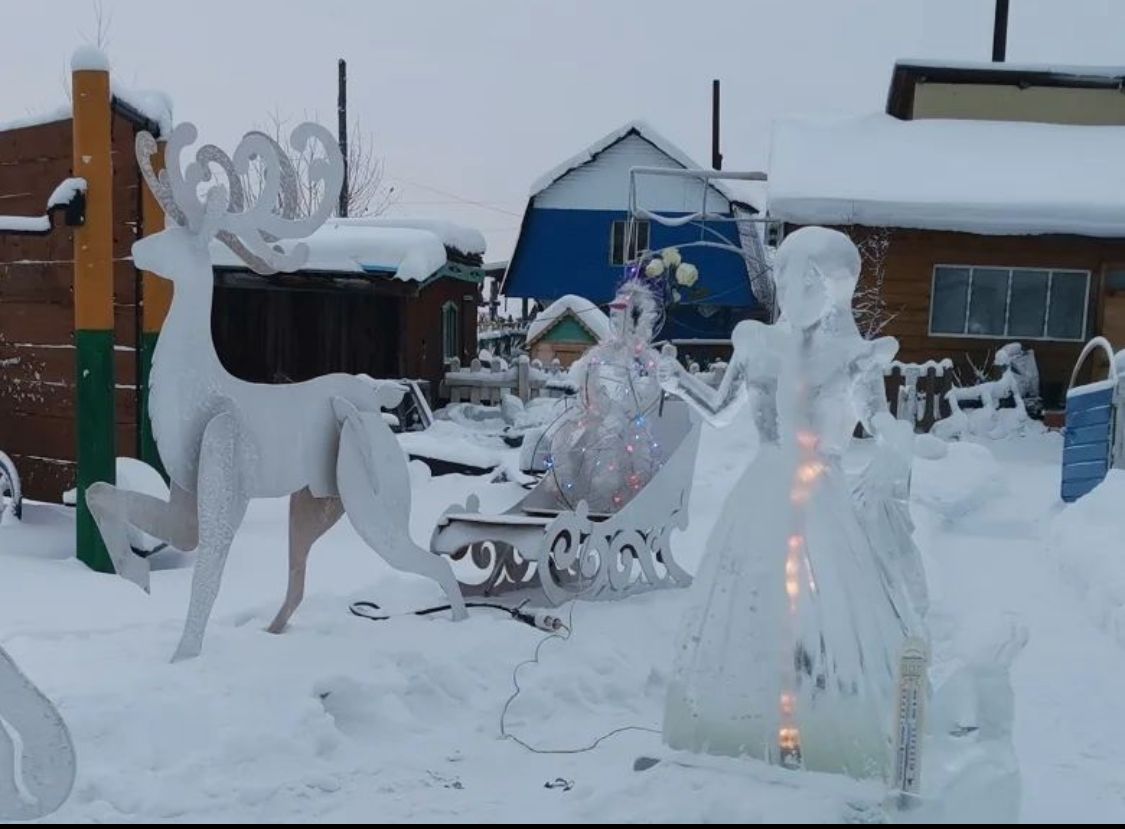 Также двор Боппосовых украшают ледовые скульптуры «Кэрэ куо» и символа 2023 года — кролика. Красавица держит в руках розы, а кролик поддерживает термометр — необычно и практично. Талантливый Иван является родным младшим братом известного скульптора из навоза Михаила Боппосова.