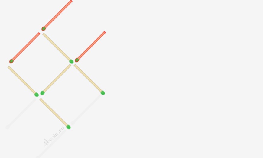Посмотрите на картинку выше — эта головоломка совсем не арифметическая, а заточенная именно на креатив. Если приглядеться, можно понять, что из спичек сложена рыбка, плывущая по своим делам. Вам нужно переставить 3 спички, чтобы развернуть рыбку на 180 градусов — то есть, чтобы она поплыла в другую сторону.