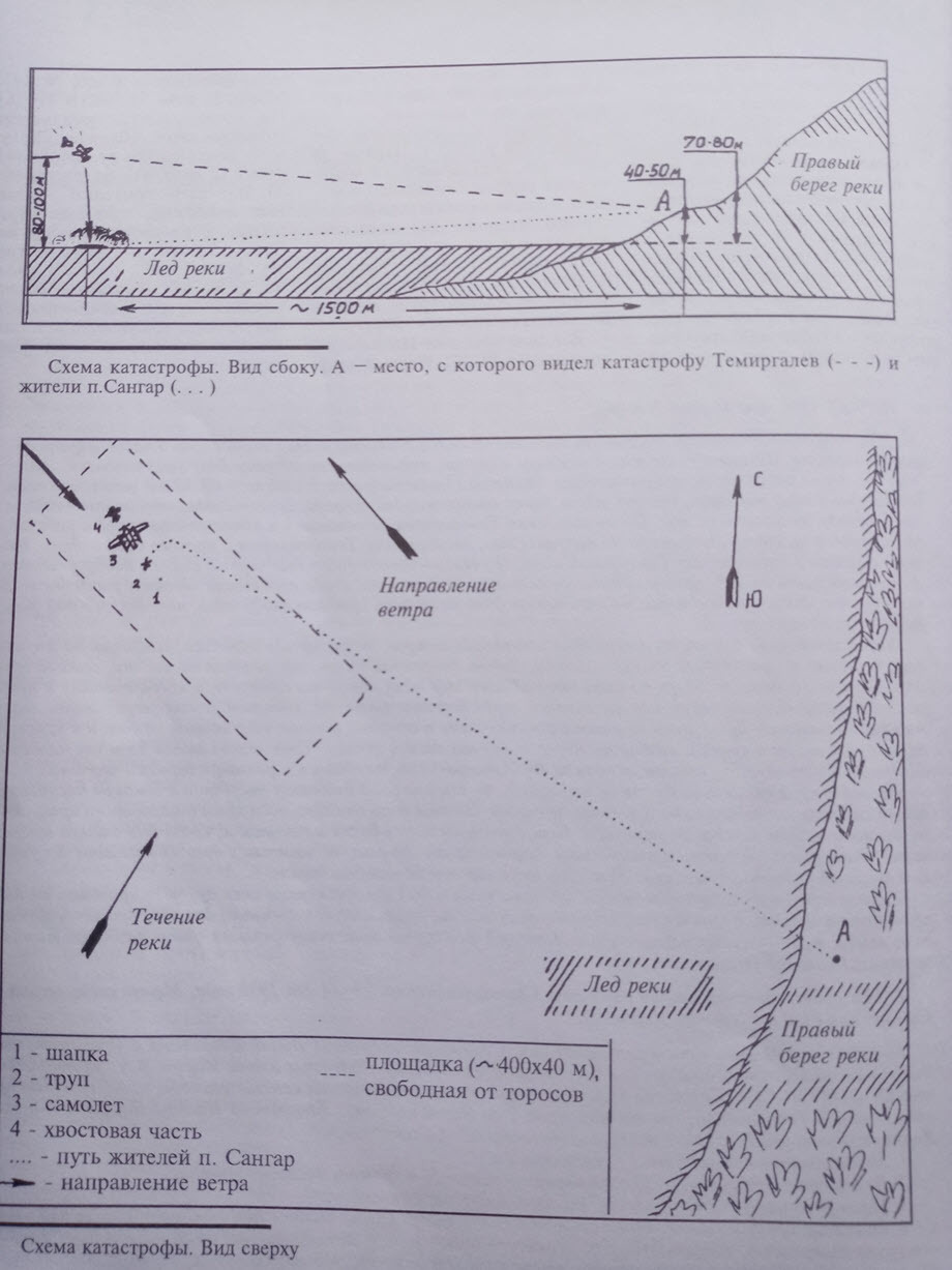 После заявления Темиргалева, находящиеся в конторе служащие и рабочие побежали по направлению… с правого берега Лены, т.е. с места расположения Сангарских копей. На северо-западе был виден черный силуэт неопределенной формы на льду на расстоянии примерно в 1,5 километрах. Дул сильный юго-восточный ветер с пургой. Когда подбежали ближе, на расстоянии нескольких метров, то различил аэроплан, разбитый на две части, передняя часть лежала кверху лыжами, задняя хвостовая часть, оторванная по кабину лежала отдельно около 10 метров.