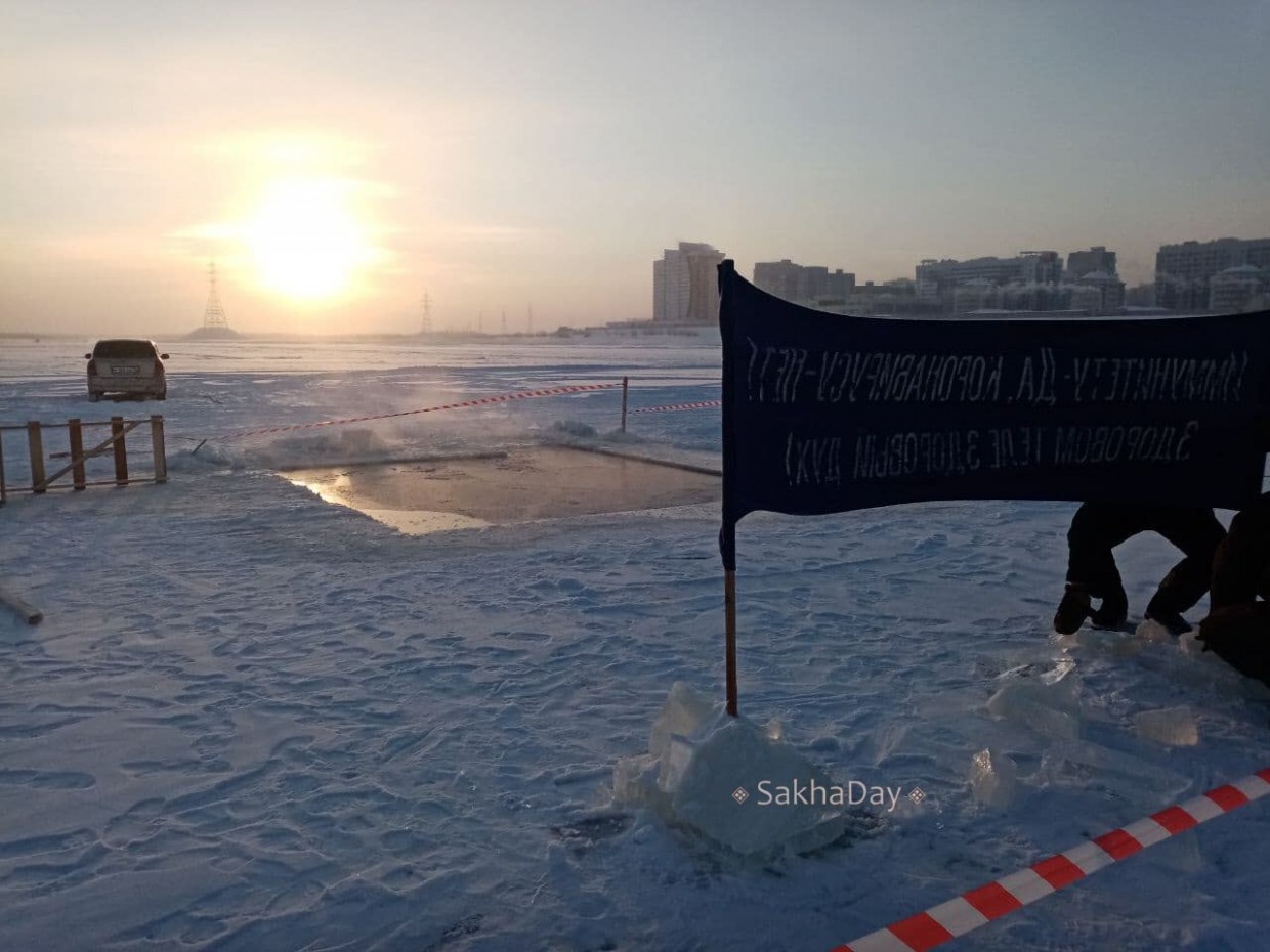 "Температура воды около + 2 градусов, но это на глубине. Как видите, на поверхности воды образовалась корка льда, на поверхности вода замерзает", - Николай Софронеев, главный морж Якутска, председатель клуба "Саха моржи".