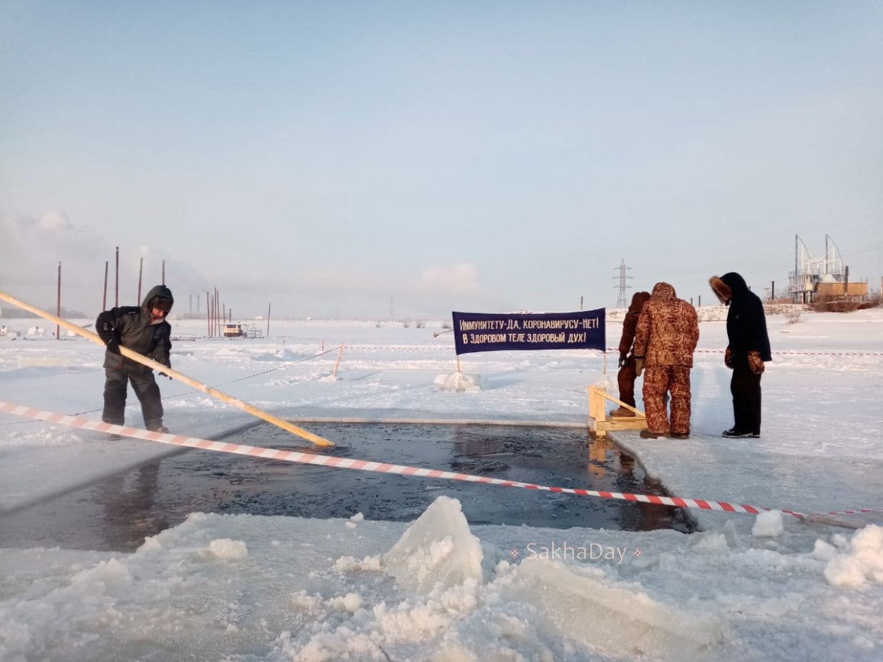 Прорубь устроили в акватории городского пляжа. Тем более, что рядом строят ледовый городок из речного льда. Заодно получилась полынья для зимнего купания.