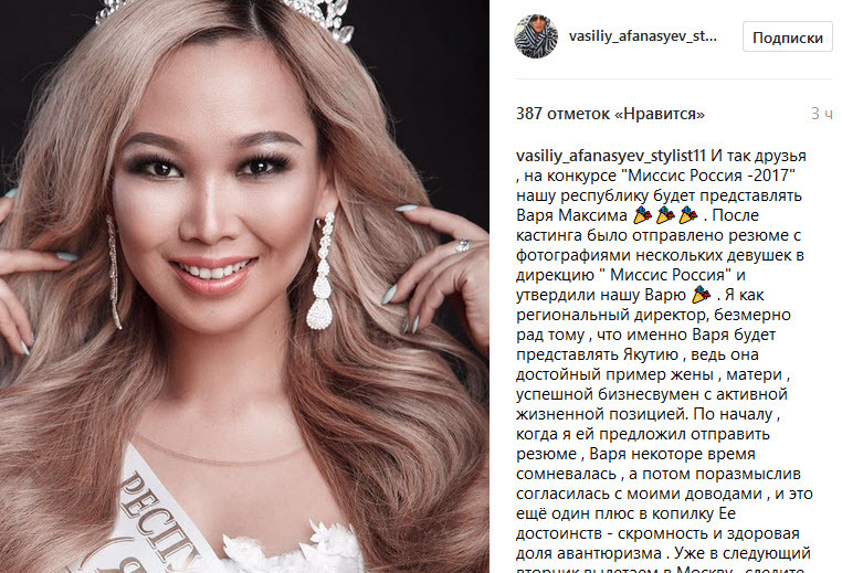 "После кастинга было отправлено резюме с фотографиями нескольких девушек в дирекцию " Миссис Россия" и утвердили нашу Варю. Я, как региональный директор, безмерно рад тому , что именно Варя будет представлять Якутию , ведь она достойный пример жены, матери, успешной бизнесвумен с активной жизненной позицией. Поначалу, когда я ей предложил отправить резюме, Варя некоторое время сомневалась, а потом, поразмыслив, согласилась с моими доводами. И это ещё один плюс в копилку ее достоинств - скромность и здоровая доля авантюризма. Уже в следующий вторник вылетаем в Москву, следите за новостями, будем держать вас в курсе. Пожелайте нам удачи". Максима О знаменательном событии сообщила и сама Варя Максима.