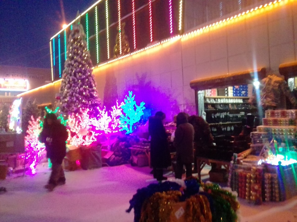 В магазинах Якутска можно выбрать любую искусственную елочку на свой вкус и цвет. Есть шикарные зеленые, роскошные белые, нежные голубые и с эффектом заснеженности елки. Мы увидели елки от 1,2 до 2,5 метров стоимостью от 1 000 до 13000 тысяч рублей. Наверняка, в каких-то магазинах есть и повыше елки, но главное что мы поняли – чем выше елка, тем стоимость тоже выше. Также цена зависит от того, есть ли у елки подсветка, встроенные шишки, игрушки и т.д. Есть даже елки, которые крутятся.