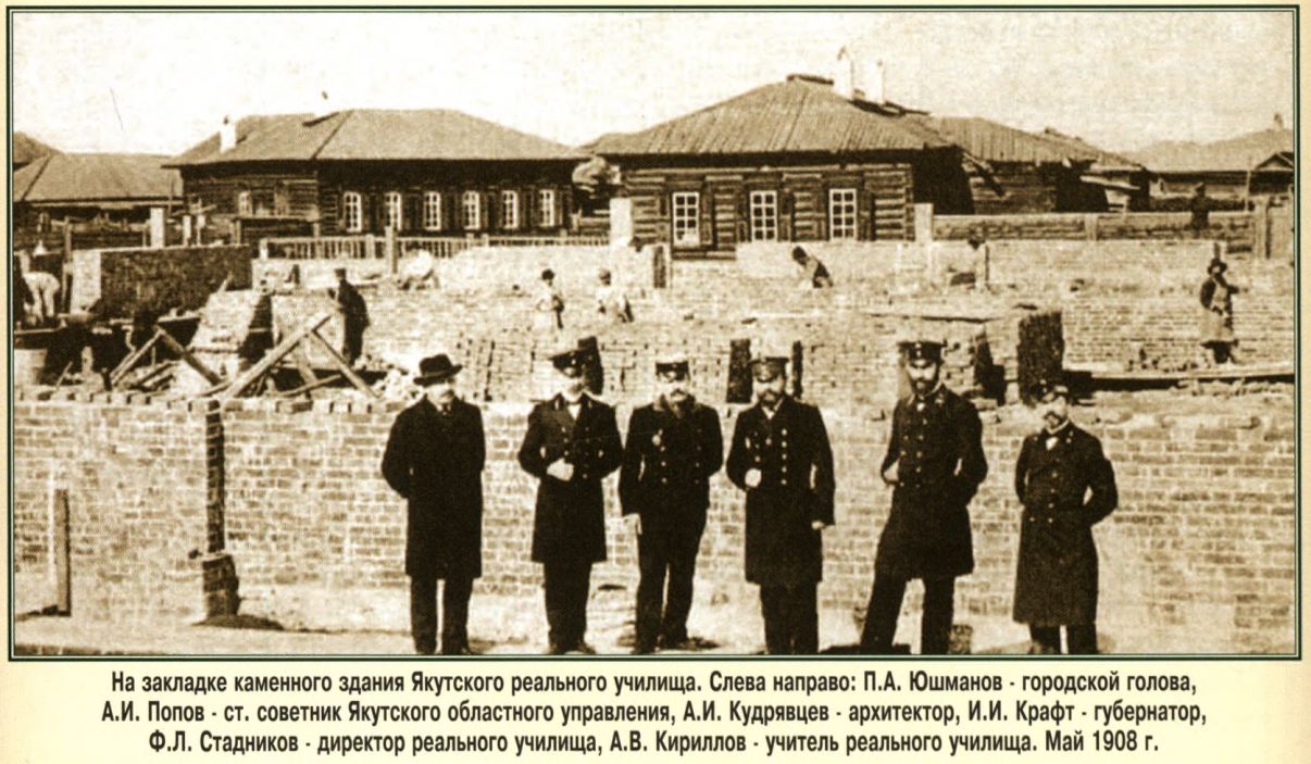 Якутские чиновники на закладке каменного здания Якутского реального училища в мае 1908 года. Как видим, трое из них, в том числе губернатор Иван Крафт держат правильный жест.