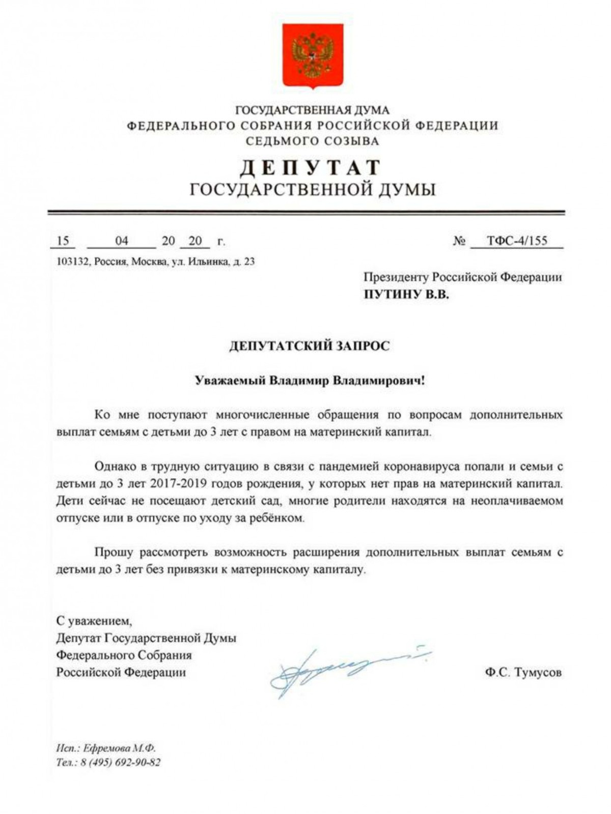 «15 апреля, – написал Тумусов у себя в Фейсбуке, – я отправил Президенту запрос о необходимости поддержки семей с детьми до 3 лет 17-19 годов рождения: они не имели право на выплаты в рамках «антикоронавирусных» мер».