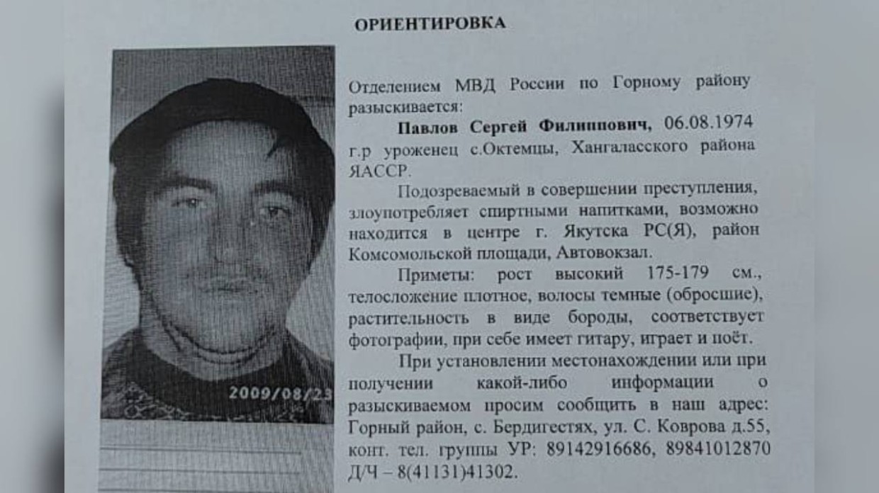 «Павлов Сергей Филиппович, уроженец с. Октемцы Хангаласского улуса. Рост высокий, телосложение плотное, растительность в виде бороды, при себе имеет гитару, играет и поет», — перечисляются приметы подозреваемого.