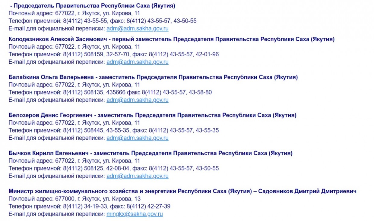 Раздел представляет контактные данные членов правительства Якутии, по которым жители республики могут направить свое обращение. Но информация давно не обновлялась. Отсутствует имя председателя правительства Андрея Тарасенко, который занимает пост с конца июля 2020 года. В качестве вице-премьеров указаны Денис Белозеров (работает заместителем сити-менеджера Калининграда с января 2021 года) и Алексей Колодезников (утвержден на должность гендиректора АО «Сахатранснефтегаз» с марта 2021 года).