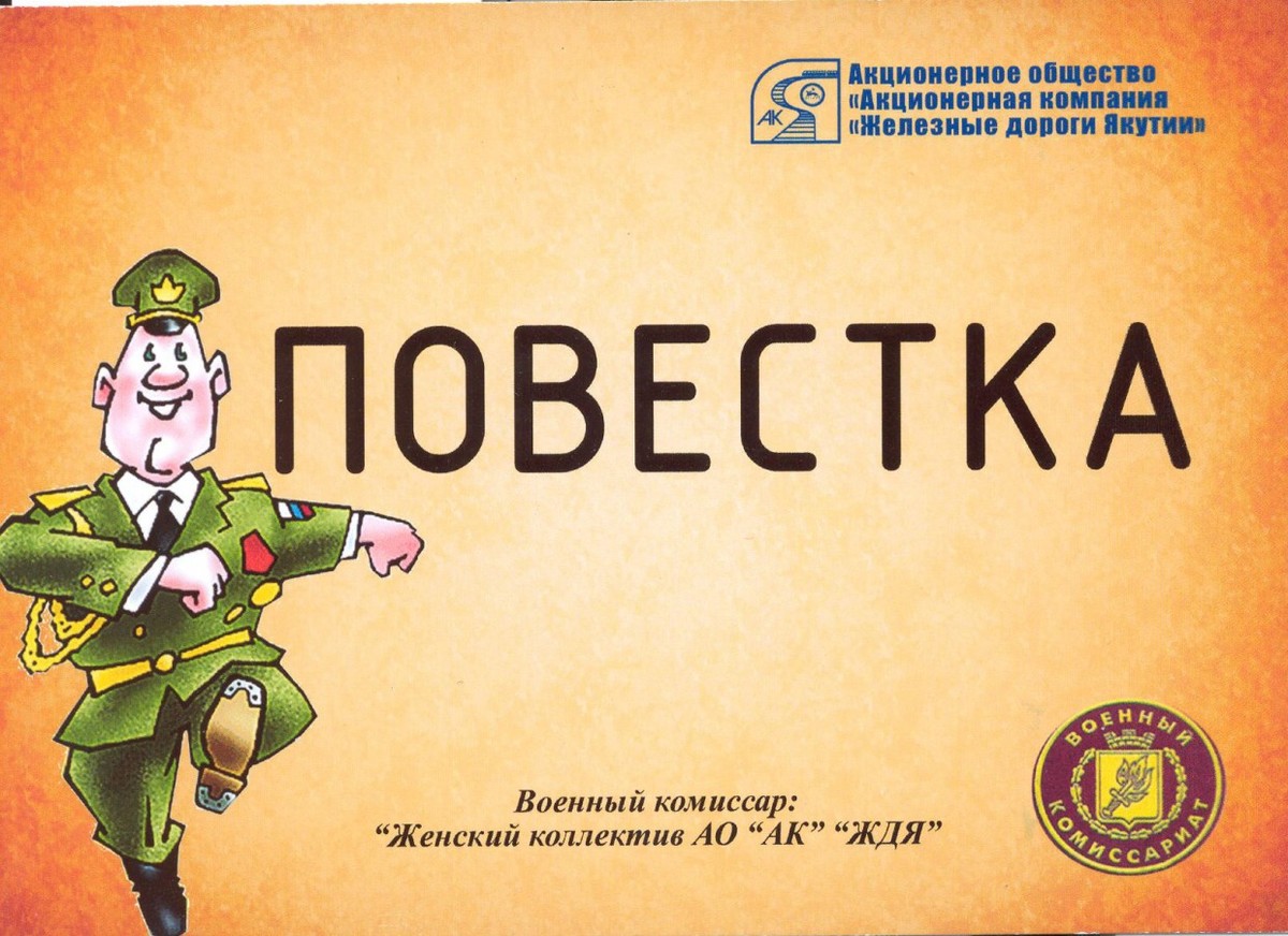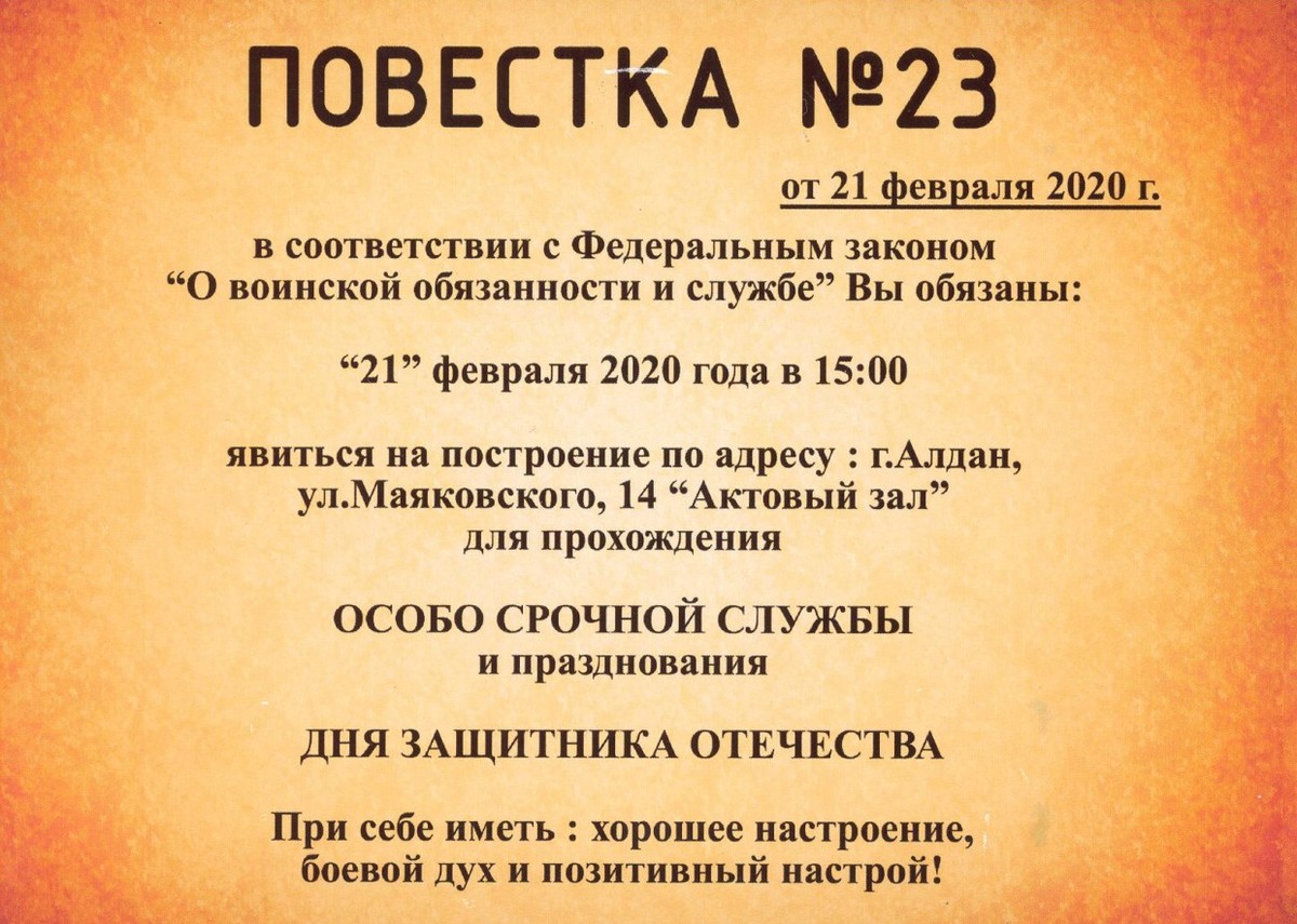 Сценарий мероприятия был продуман заранее и включал в себя предварительную выдачу повесток сильной половине коллектива. В шуточной форме, но не терпящей отсрочки, мужчинам предлагалось «явиться на построение по адресу: г.Алдан, Маяковского, 14 для прохождения особо срочной службы и празднования ДНЯ ЗАЩИТНИКА ОТЕЧЕСТВА. При себе иметь: хорошее настроение, боевой дух и позитивный настрой».