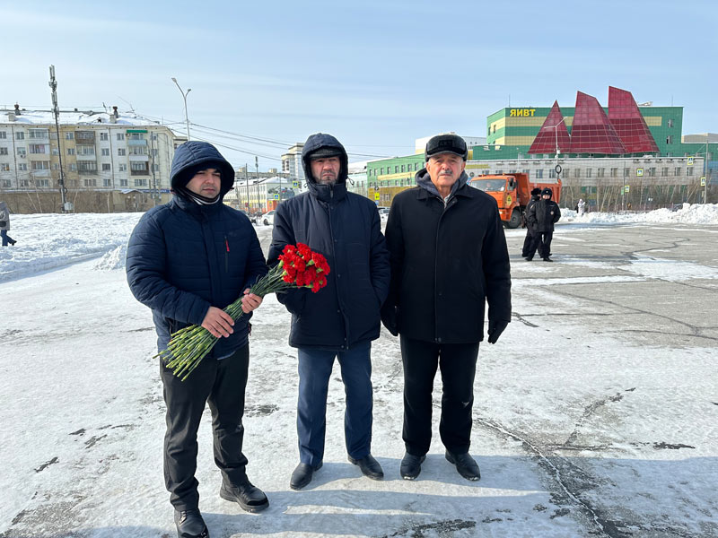 Ходи Оев (посередине) во время возложения цветов в Якутске в память о погибших в результате теракта. 24 марта 2024 года.