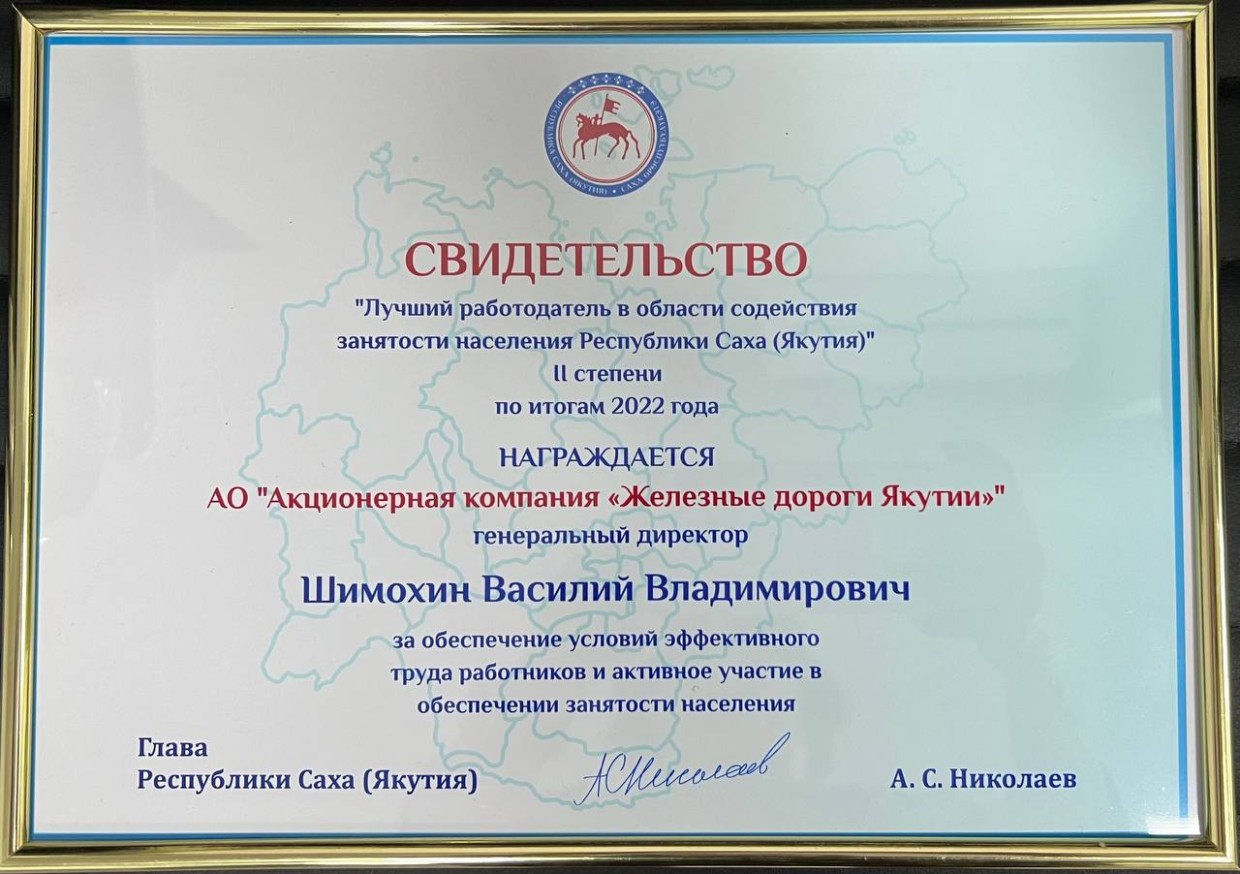 Акционерная компания «Железные дороги Якутии» стала победителем конкурса «Лучший работодатель в области содействия занятости населения Республики Саха (Якутия)».