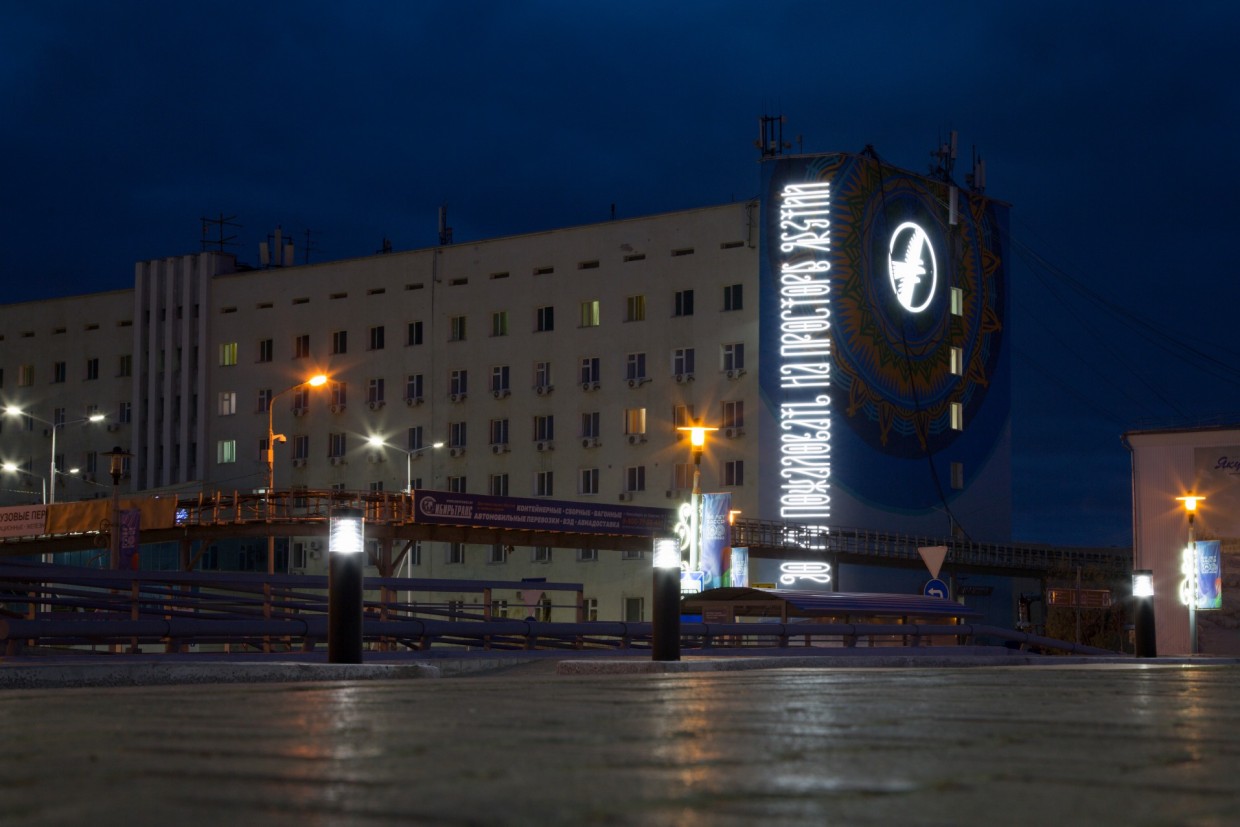 На территории аэропорта «Якутск», на фасаде гостиницы «Лайнер», заработала подсветка мурала. Архитектурно-художественная графика «Срединный мир» стала совместным проектом аэропорта, дизайнера и руководителя студии «Сулусчан-Арт» Ростислава Павлова и известной художницы Кыыдааны Игнатьевой.