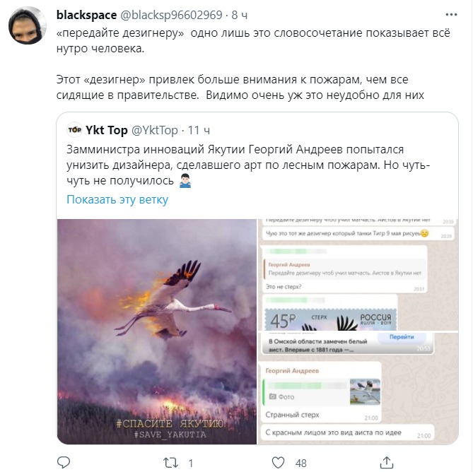 Замминистра инноваций Якутии Георгий Андреев усомнился, что в арте по проблеме лесных пожаров в республике автор использовал изображение стерха. Выяснилось, что Андреев ошибся. Об этом YktTop написал твит, который собрал более 300 реакций в целом.