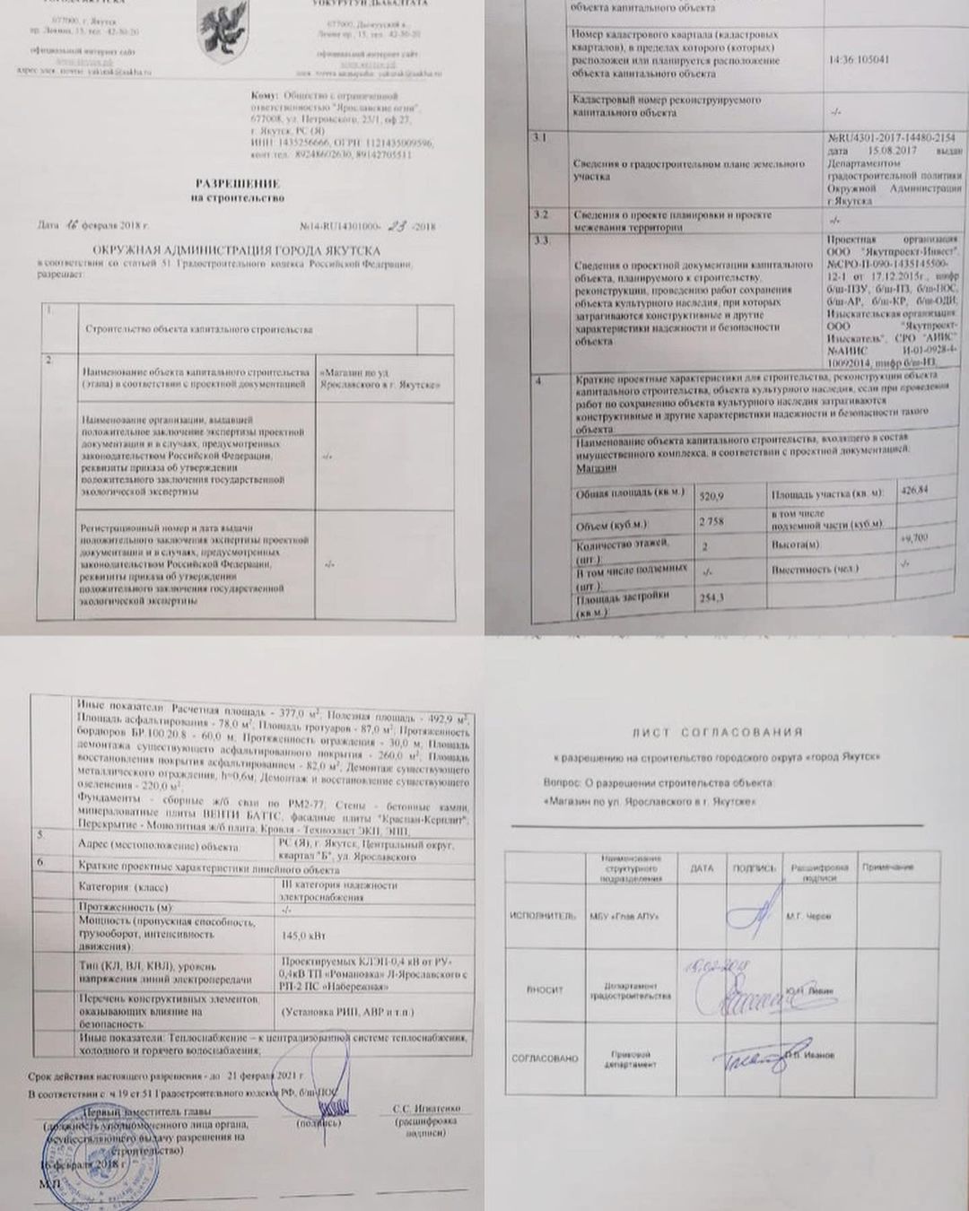 Напомним, что о непростом участке и сомнительном способе получения разрешения на строительство писал Антон Жондоров в News.Ykt.Ru. Предприниматель Айкарам Давтян выкупил этот участок у Лены Шелест, которая получила его под строительство магазина. Но оформить разрешение ей не удалось. ООО "Ярославские огни" получали отказ за отказом, так как градостроительный план участка не соответствует градостроительным регламентам, эскиз не был согласован с главным архитектором Якутска, проект не соответствует плану, а такж не соблюдены минимальные отступы от границ участка до фасадов зданий. То, что не удалось супругам Шелест - удалось Айкараму Давтяну. Он смог получить разрешение на строительство.