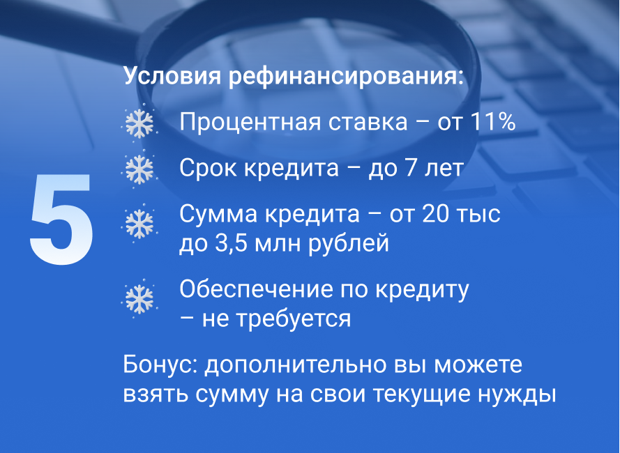Заменив текущие кредиты с высокими процентными ставками на один более выгодный, вы избавитесь от чрезмерной нагрузки на семейный бюджет. И это позволит вам увидеть новые возможности для себя и воплощения в жизнь новых планов.