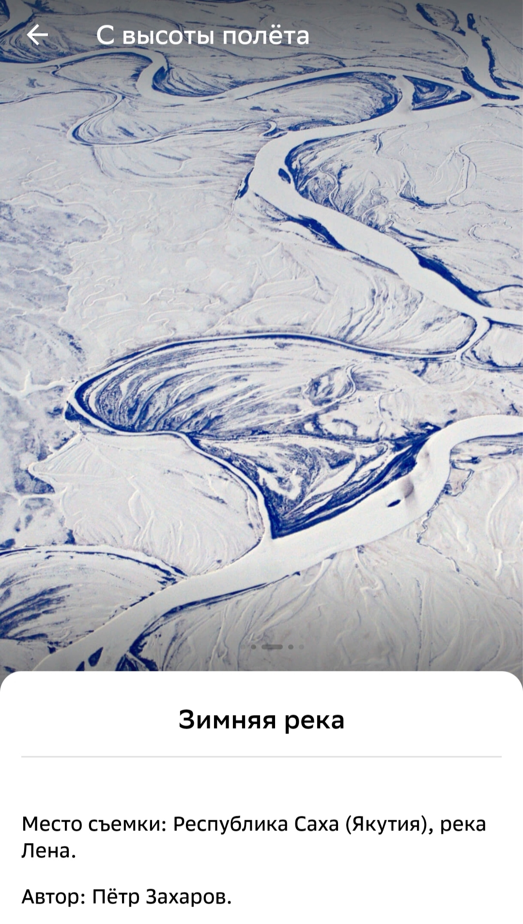 «Фотоконкурс «Самая красивая страна» — масштабный проект Русского географического общества, объединяющий лучших фотографов России. Работы победителей восхищают и завораживают. И нам очень хотелось, чтобы их увидели наши клиенты. Сейчас доступны зимние фотоработы с высоты птичьего полёта. Весной появятся весенние уголки России, потом соответственно можно будет увидеть летние и осенние виды страны. Открывайте Россию заново вместе с Русским географическим обществом и Сбером!».