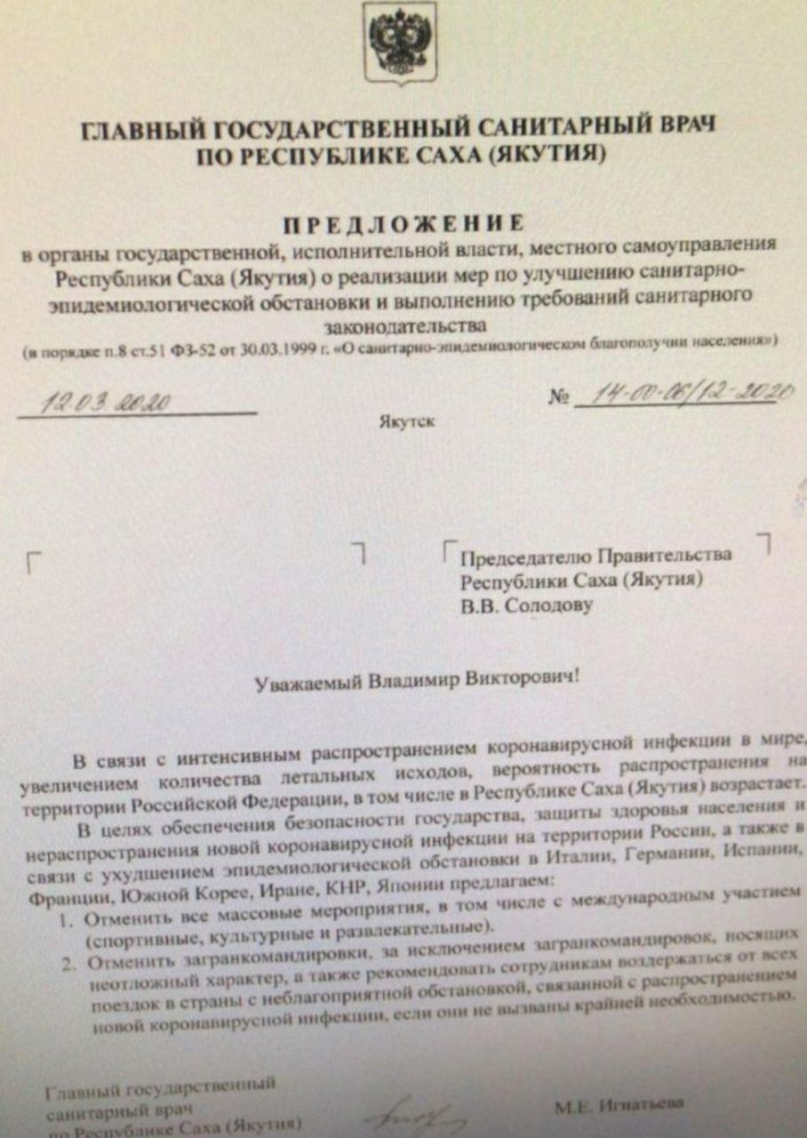 Внесено предложение Главного государственного санитарного врача по Республике Саха (Якутия) Правительству Республики Саха (Якутия) об отмене всех массовых мероприятий, в том числе с международным участием (спортивные, культурные и развлекательные), загранкомандировок, за исключением загранкомандировок, носящих неотложный характер, а также рекомендовано сотрудникам воздержаться от всех поездок в страны с неблагоприятной обстановкой, связанной с распространением новой коронавирусной инфекции, если они не вызваны крайней необходимостью.