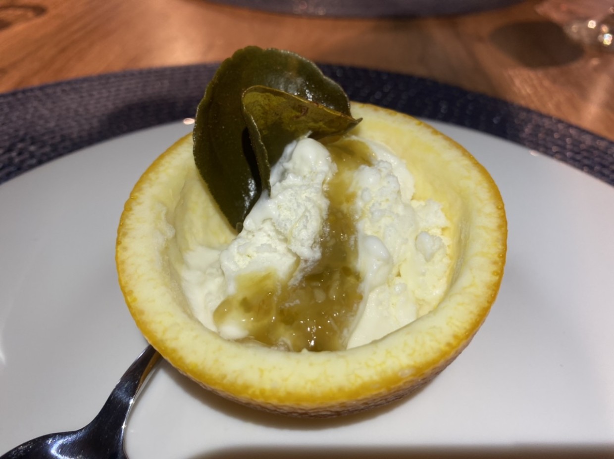 Затем настало время десерта – мороженое с цитрусом и нотками кафира (родственник лайма, но более терпкий на вкус).
