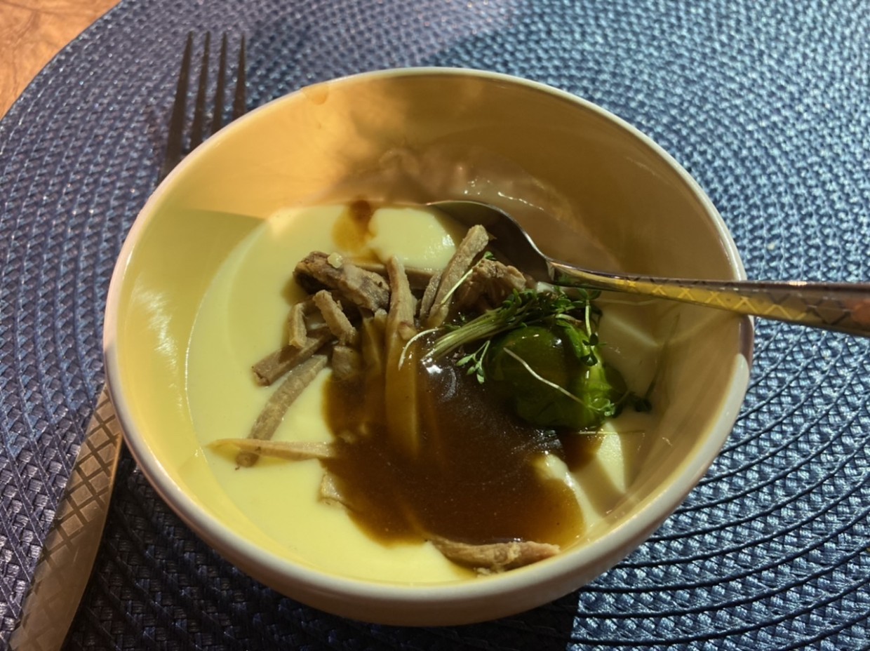 На мой вкус, команде поваров удалось воплотить замысел. Так как мне нравится сочетание чили с ягодами и фруктами, это блюдо меня очень порадовало. Сезонные ингредиенты: рябина, крыжовник, опята, – позволяют прочувствовать осень. Авокадо, опаленное синим пламенем, позволило сбалансировать остроту (как рис в острых азиатских блюдах), а еще сделало горячее более сытным. Оленина была ароматной и сочной, ничуть не уступила свое главенство ягодам, наоборот раскрылась с благородной стороны.
