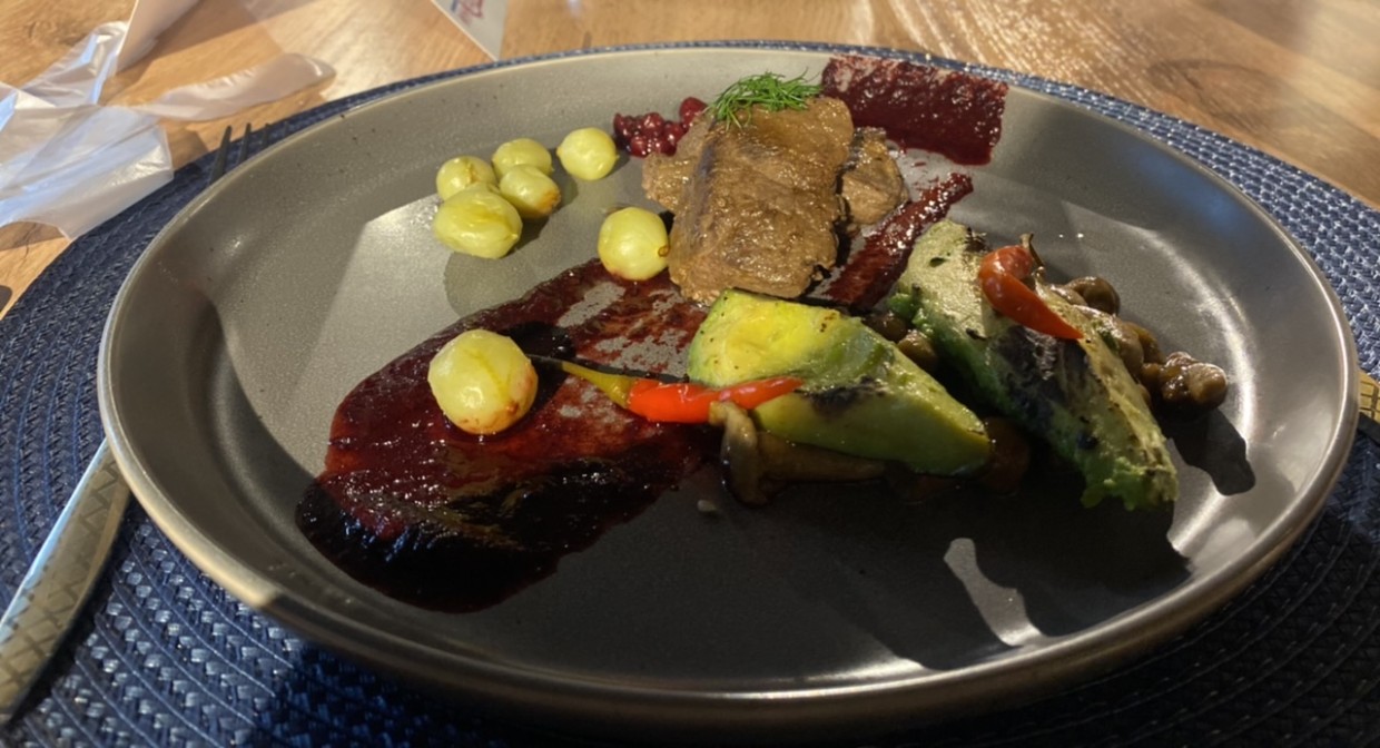 «Чили мне кажется лишним. Острота перебивает вкус оленины. Но сама оленина вместе с крыжовником и авокадо мне понравились», – поделилась своим мнением Аина.