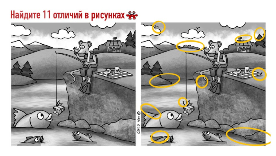 Этот мышонок точно знает, что порыбачить еще можно. Вон, сколько желающих пойматься на его удочку! Но рыбалка — занятие тихое, расслабленное. А 11 отличий на двух картинках сильно мешают мышонку сконцентрироваться на ловле золотой рыбки и парочки других впридачу. Найдите отличия — помогите ему собрать добротный улов.