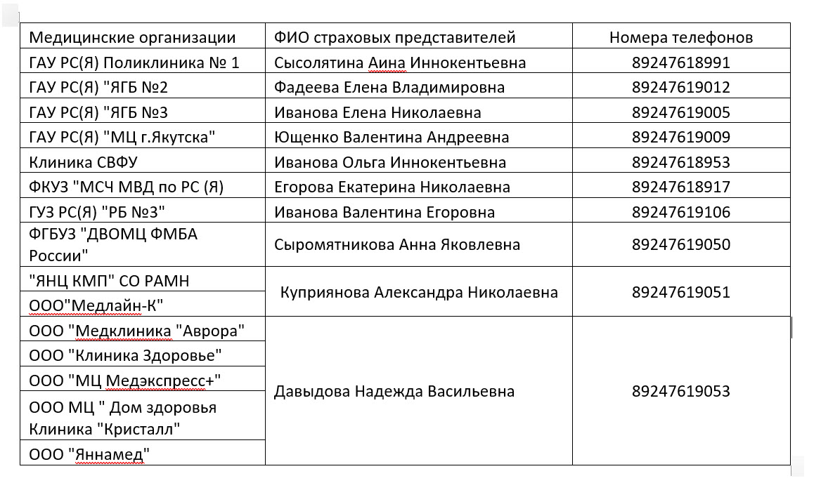 В г. Якутске к страховым представителям «Сахамедстрах» обращайтесь по следующим телефонам в соответствии с поликлиникой, к которой прикреплены:
