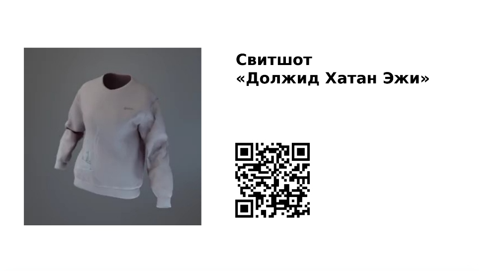 Свитшот «Должид Хатан Эжи». Должид Хатан Эжи — великая мать-ханша, представленная в традиционном бурятском костюме. Она совершает молитву, поэтому лицо выражает спокойствие. Владычица окружена традиционными атрибутами хозяйки домашнего очага в Забайкалье, рядом с ней — чаша, маслобойка, сосуд для воды и ковер.