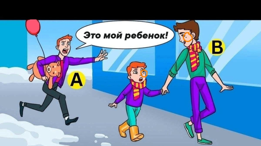 Один мужчина несет игрушку и шарик, другой приветливо улыбается. Но ключевой момент — это эмоции ребенка. Замешательство на его лице может быть вызвано не страхом, а скорее неожиданным криком позади. Он держится за руку одного из мужчин, и нет никаких признаков того, что он пытается убежать, что говорит о доверии. Более того, обратите внимание на одежду — у мальчика и мужчины, обозначенного буквой В, одинаковые шарфы.