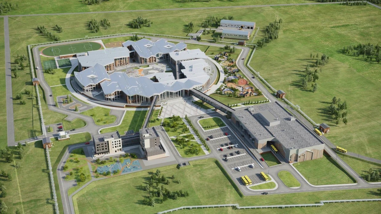 Образовательный комплекс «Точка будущего» в Якутии – это современный многофункциональный архитектурный ансамбль, включающий в себя семь школьных корпусов общей площадью почти 33 тыс. м2.