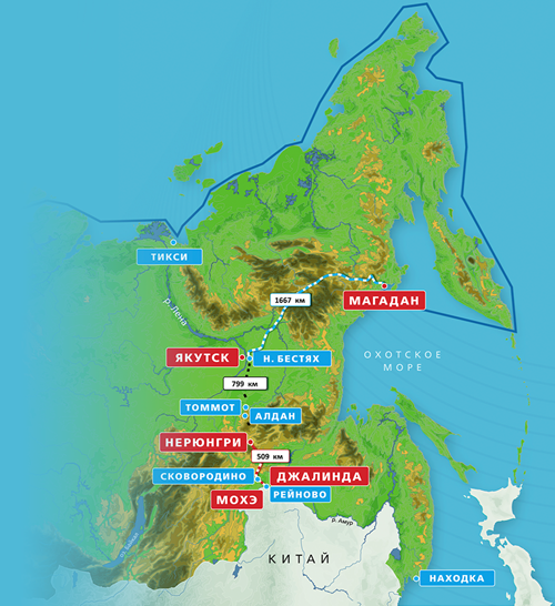 Вторым стратегическим направлением является строительство железнодорожной линии Нижний Бестях – Магадан. Проект будет реализован в три этапа: Нижний Бестях – Хандыга (375 км), затем до Сусумана и, наконец, до морского порта Магадан, который может стать ключевым хабом Трансарктического коридора.