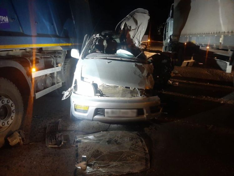 По предварительной информации, водитель легкового автомобиля Toyota Lite Ace Noah - мужчина 1978 г.р. - совершил столкновение с двумя грузовыми Volvo: самосвалом и тягачом. Один из большегрузов двигался по встречной полосе, второй осуществлял поворот налево.