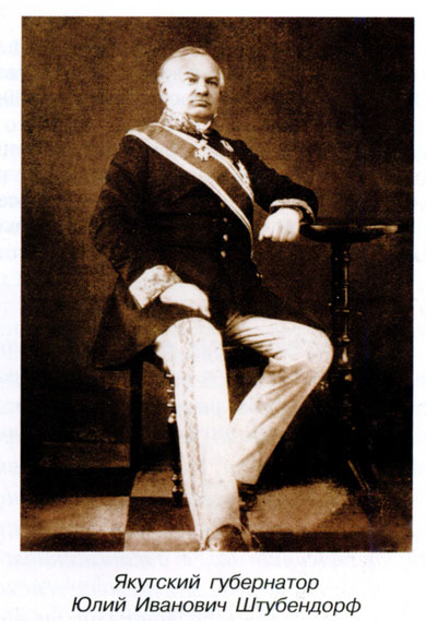 - Юлий Иванович Штубендорф. Управлял Якутской областью пять лет – с 1857 по 1862 годы. За это короткое время успел сделать многое. Будучи сам медиком, улучшил медицинское обслуживание населения, на народное образование - при Штубендорфе открылись воскресные школы. Впервые библия была переведена на якутский язык, прошло первое богослужение на якутском языке. Способствовал распространению в Якутии огородничества.