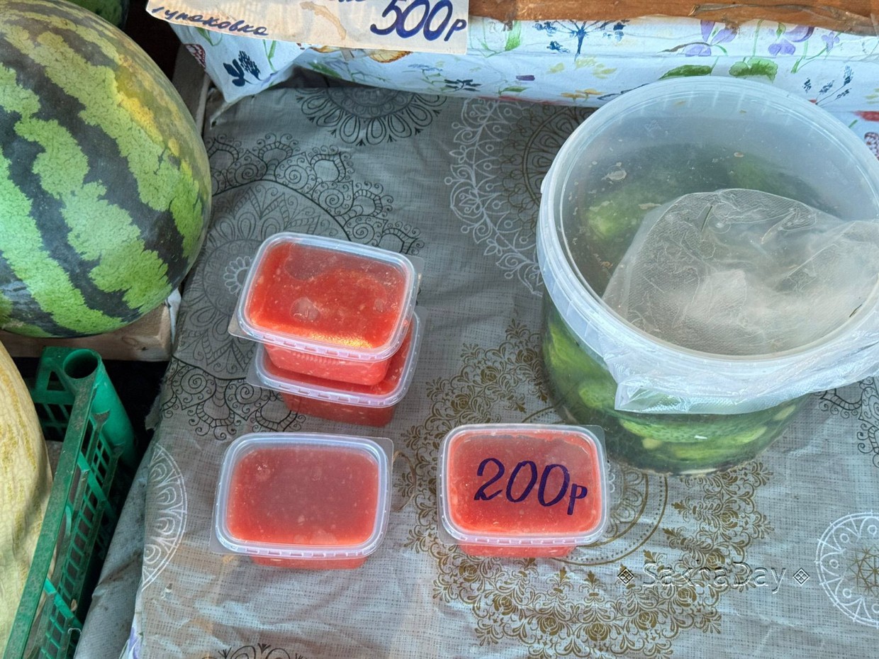 Если уж пришли на рынок, то расскажем и о фруктах. Арбузы продаются от 80 рублей за кг, местные арбузы по 200 рублей за кг. Дыни стоят от 180 рублей. Стаканчиком клубники можно полакомиться за 500 рублей.