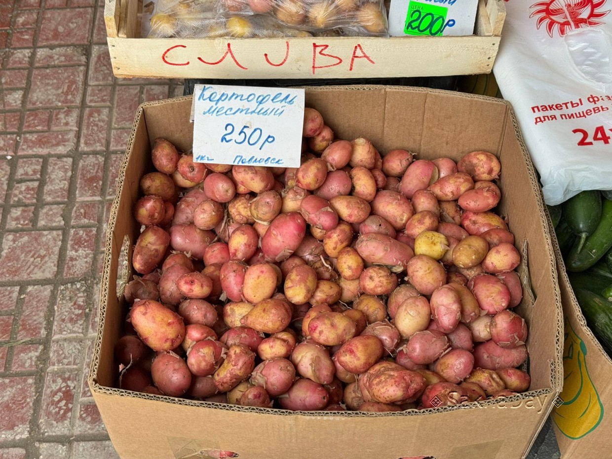 Свежая картошка стоит 250 рублей за килограмм. Есть привозная свежая за 100 рублей. Она упакована в сетки.