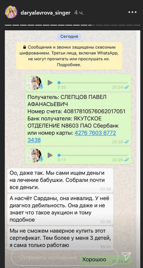 Во время благотворительного онлайн-концерта якутской певицы Даши Лавровой был проведен аукцион в помощь Вере Слепцовой sleptsovavp19, которой предстоит онкологическая операция. Однако победители аукциона отнеслись к нему несерьезно, восприняв как игру.