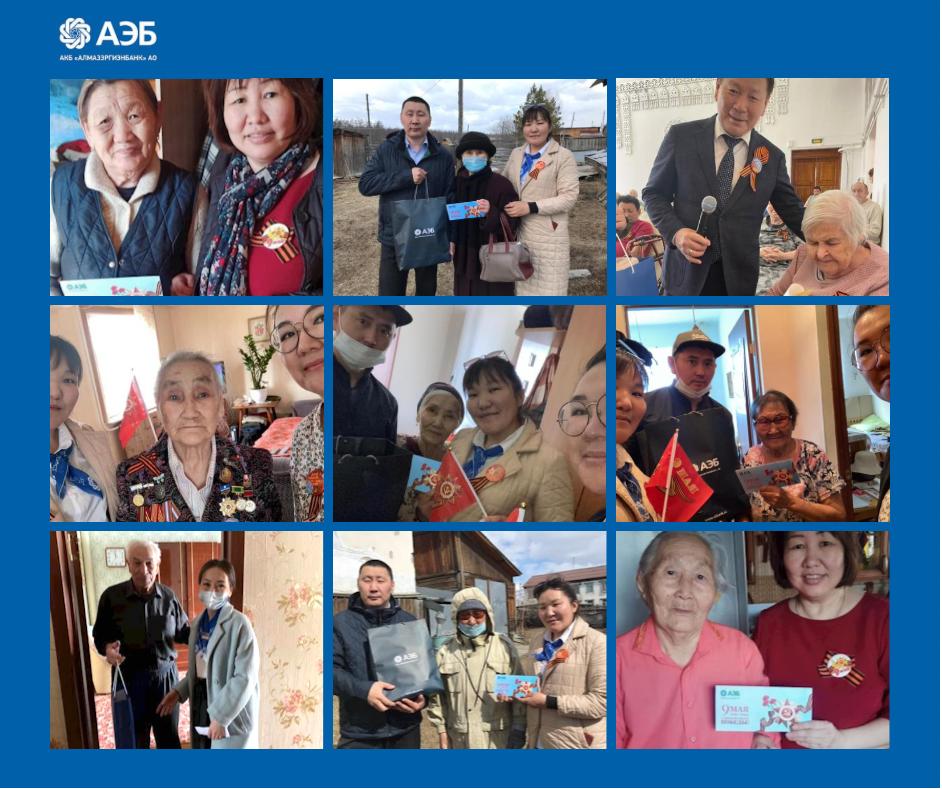 Традиционную акцию АЭБ по чествованию ветеранов поддерживают все специалисты банка во всех офисах по республике — от Алдана до Усть-Неры. Работники якутского банка адресно собирают деньги на подарки и накануне священной даты вручают их ветеранам с благодарностью и самыми тёплыми пожеланиями.