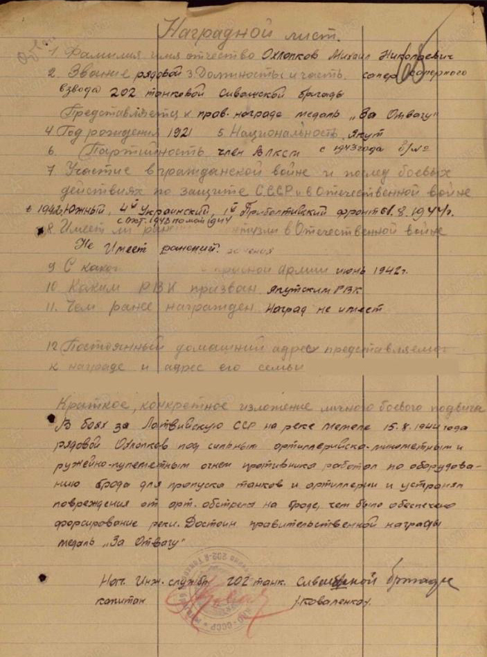 - Мой дед по отцовской линии – Охлопков Михаил Николаевич, 9 октября 1921 года рождения, 7 июня 1942 года был мобилизован в ряды Красной Армии. Семь тысяч якутов и русских, 9 июня в 9 часов вечера на пароходе «Киров» были направлены на войну.