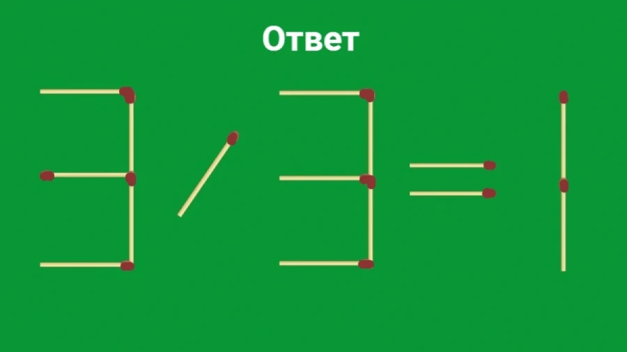 Посмотрите, как все просто! Спичку нужно было перенести внутри цифры 5, чтобы получилась цифра 3. Итого — 3/3=1, идеальный результат. Решите другую задачку.