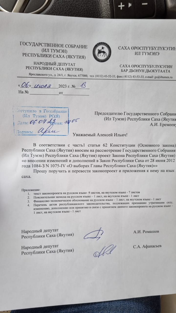 6 июля депутаты фракции «СПРАВЕДЛИВОЙ РОССИИ – ЗА ПРАВДУ» Ил Тумэна внесли в парламент республики законопроект об изменении закона «О выборах Главы РС (Я)». Согласно ему, дорогу в Ил Дарханы могут открыть и самовыдвиженцам, которые сегодня почему-то поражены в таких правах.