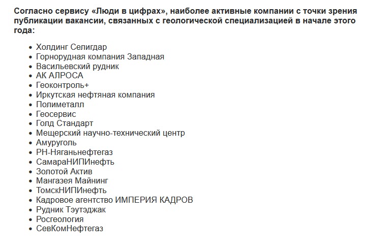«Интересно, что параллельно росту предлагаемых зарплат компании наращивают и требования к кандидатам на позиции геологов. Так, в топ навыков, которые чаще сейчас указывают в вакансиях для геологов, входят не только hard skills: знание различных проф.программ (AutoCAD, CorelDRAW), полевые работы и камеральные исследования, знания по бурению и определению пород и др., но и soft skills: умение работать в коллективе, планировать работу, деловое общение.