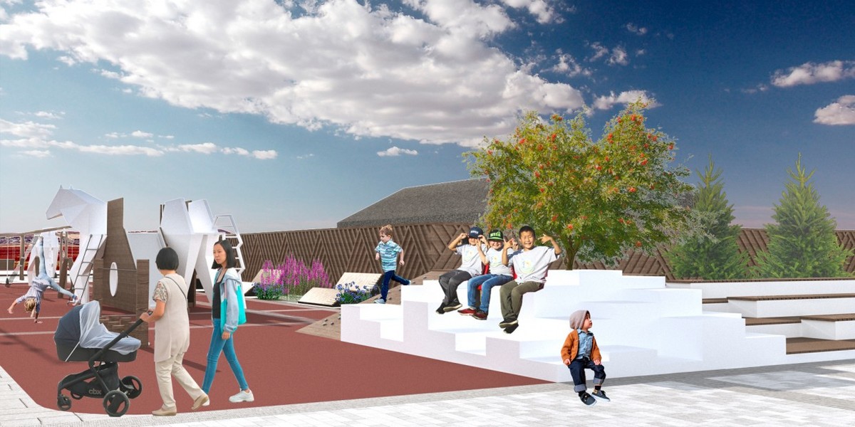 Подчиняясь главной оси, ведущей к стеле, создаются новые сценарии использования территории. В этом пространстве находятся игровые площадки, сцена для выступлений, фотозоны, качели, настольный теннис и беговая дорожка. Детская площадка, со стилизованным оборудованием под белых лошадей, предлагает детям активные игры. На площади разместились также знаки города в виде световых арт-объектов лошадей и мамонта. Для северных городов особенно важно обеспечить комфорт на улице. Поэтому проектом предусмотрен круглогодичный павильон с открытой площадкой, где жители могут погреться в кофейне. Преобразование центральной площади «Колымское подворье» принесёт новую жизнь в один из самых отдалённых городов Якутии.