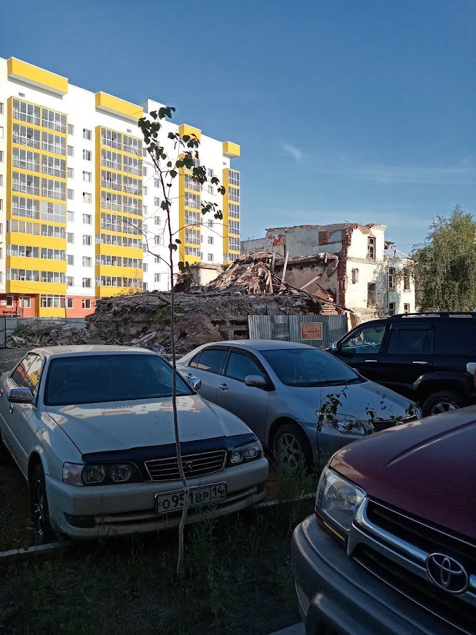 Фото снесенной Рабочей бани было сделано в июле 2020 года. На заднем фоне видны новостройки. Сейчас о Рабочей бане напоминает только остановка с таким же названием.
