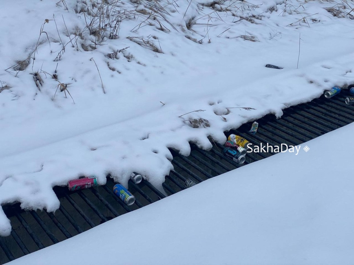 Территория вокруг Якутского автодорожного техникума оказалась полностью покрыта твердым мусором. Примечательно, что в основном это валяются жестяные банки из-под энергетиков.